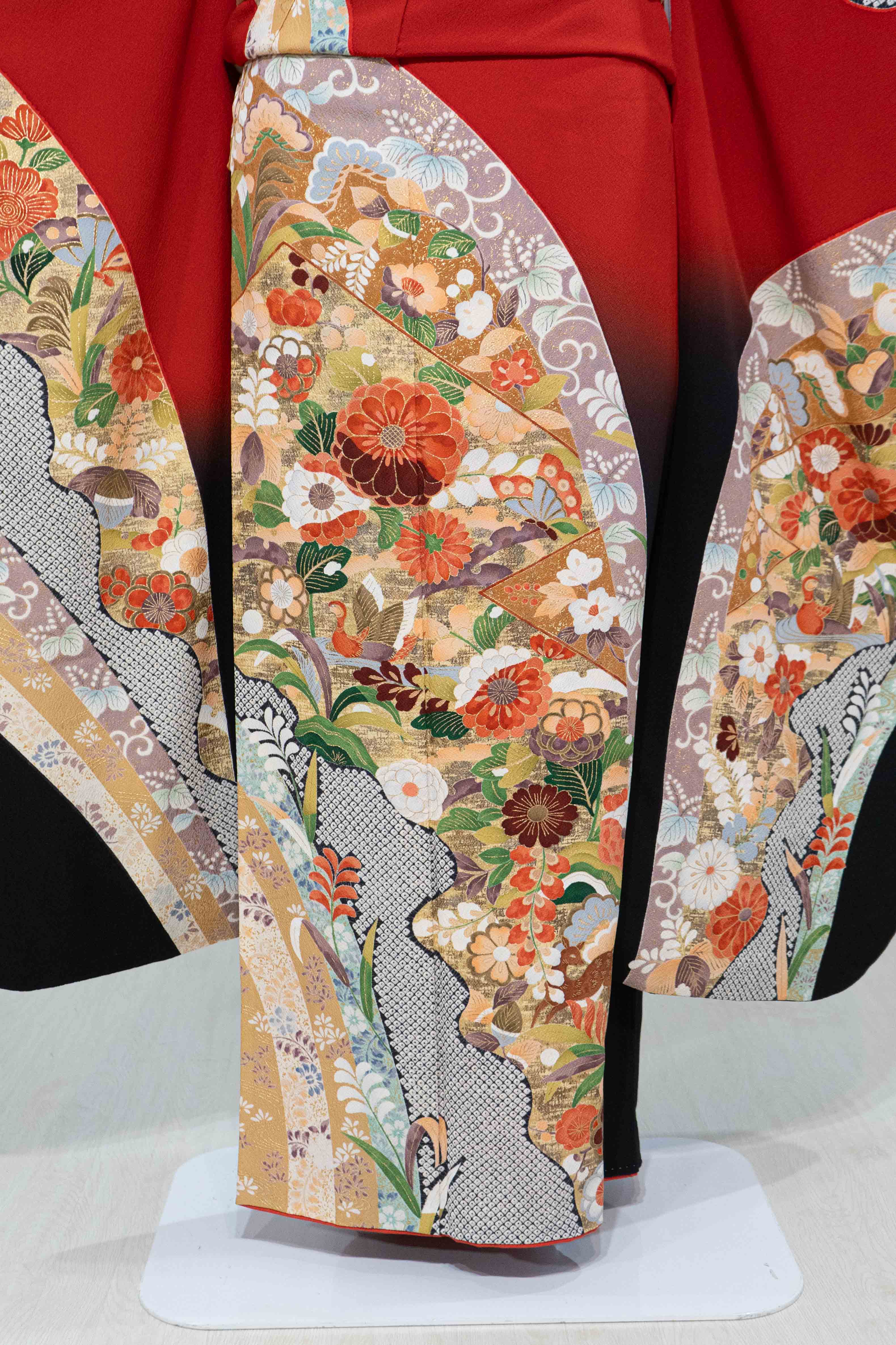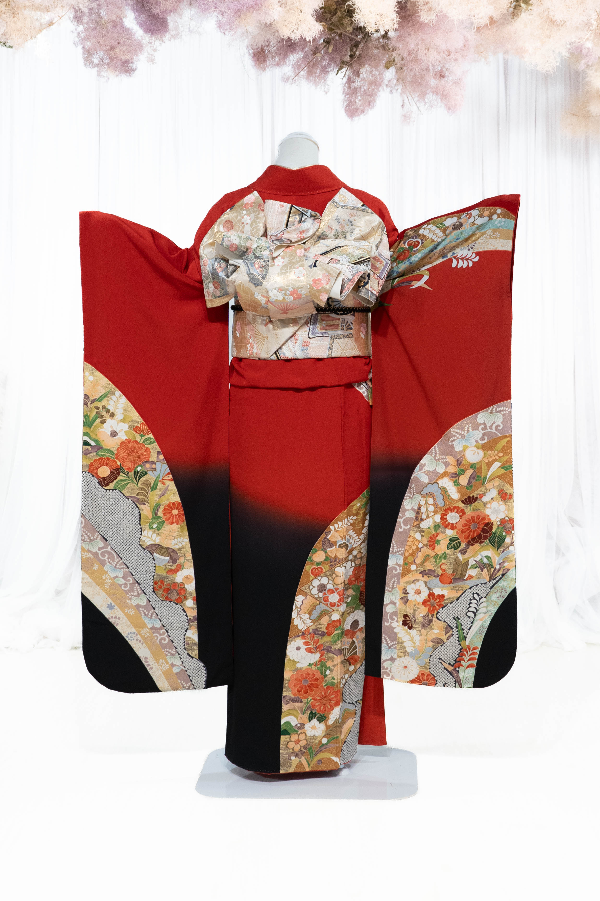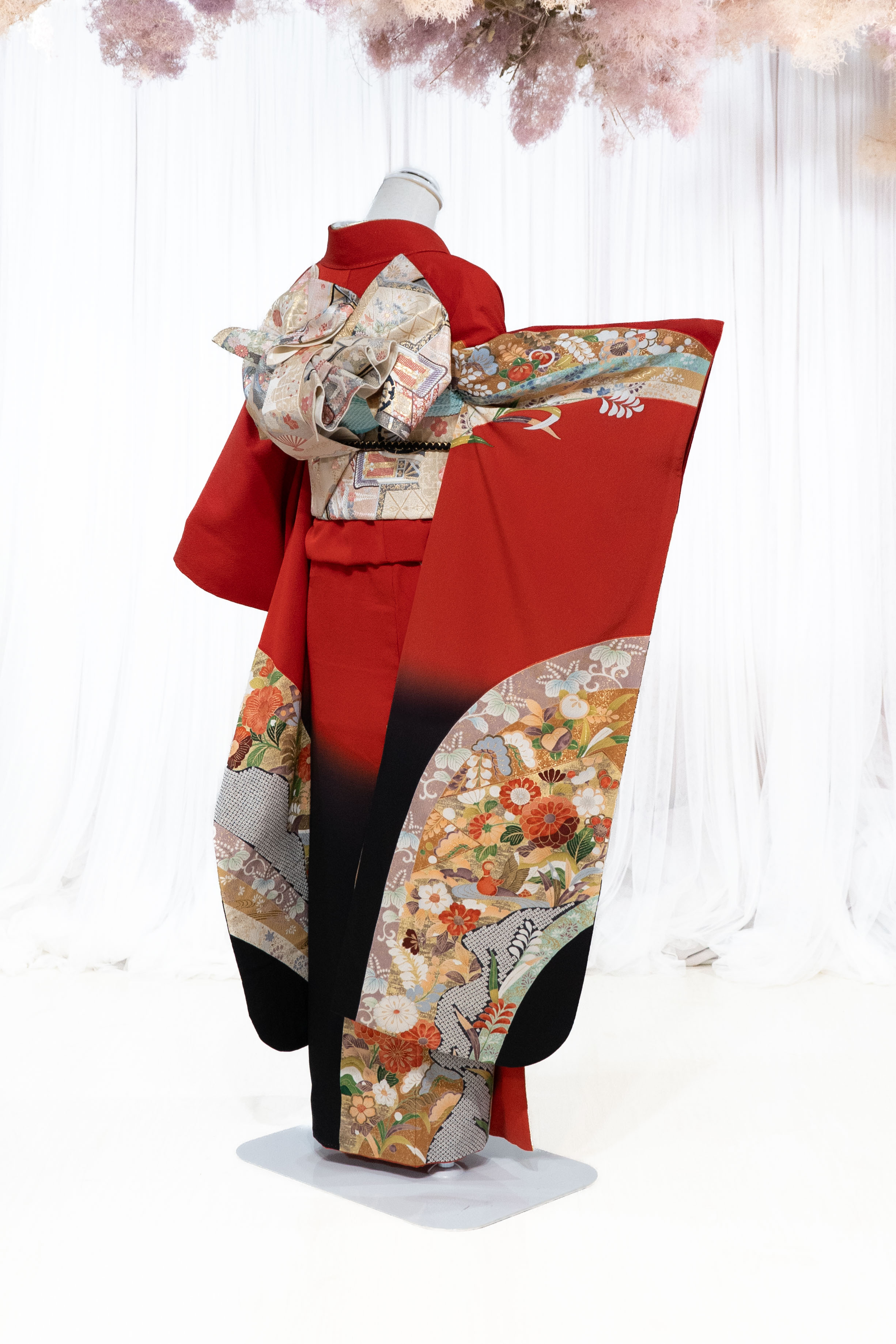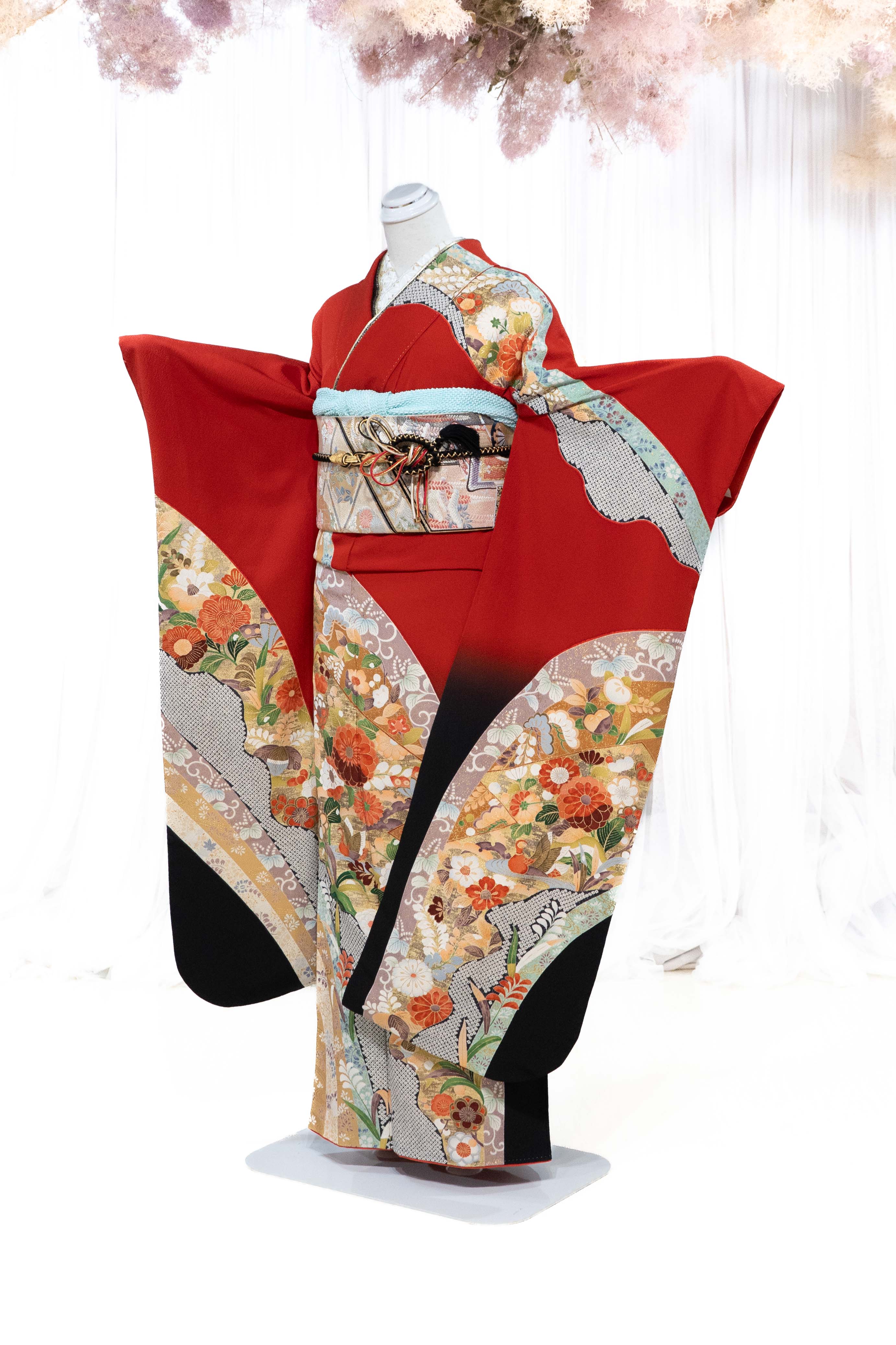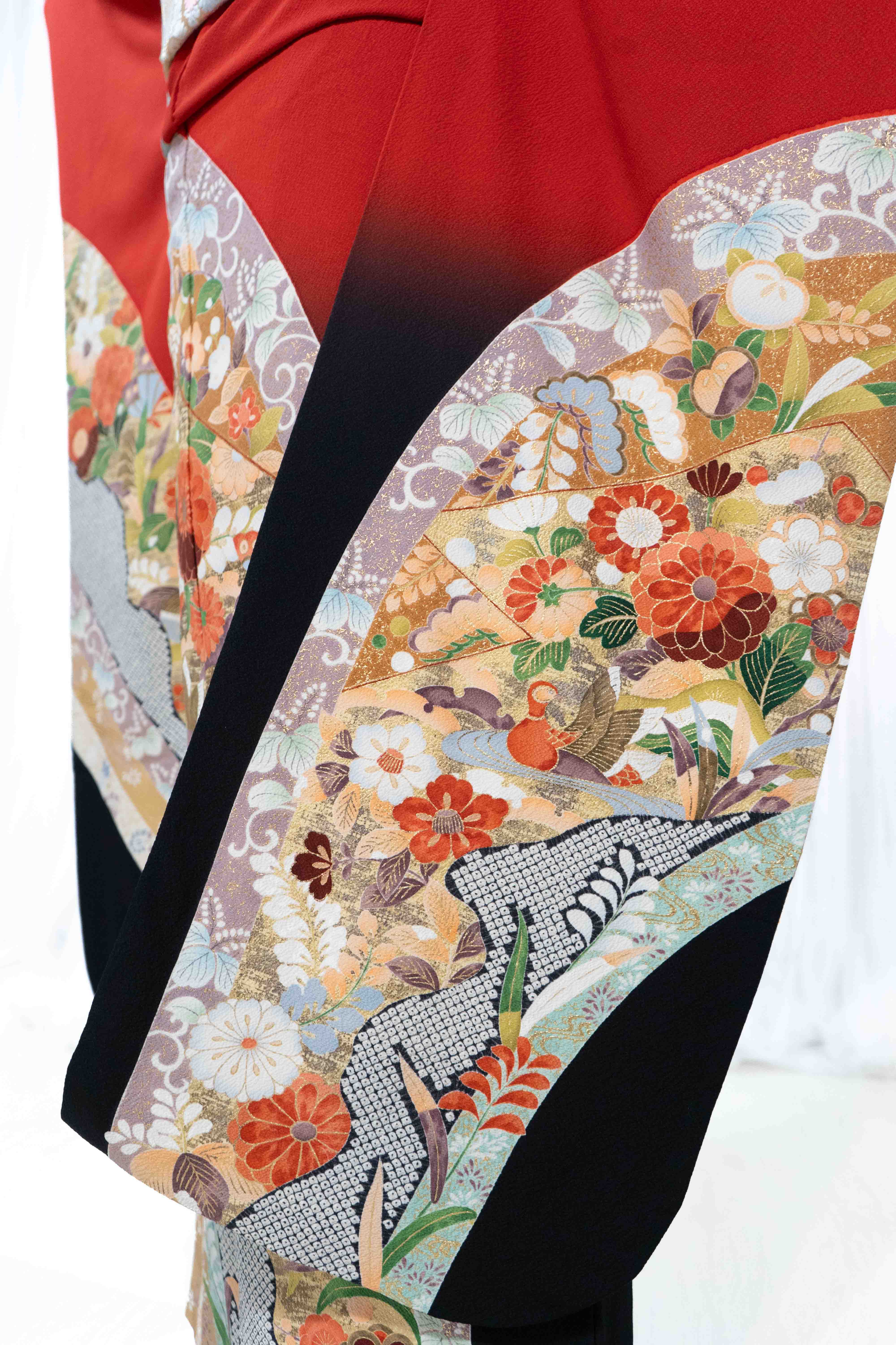 クリアな赤に草花や鴛鴦を弧状に描れており、すっきりとした華やかさが特徴の振袖です。可愛らしい柄行ですが、裾の黒ぼかしがクールな印象を与えてくれます。