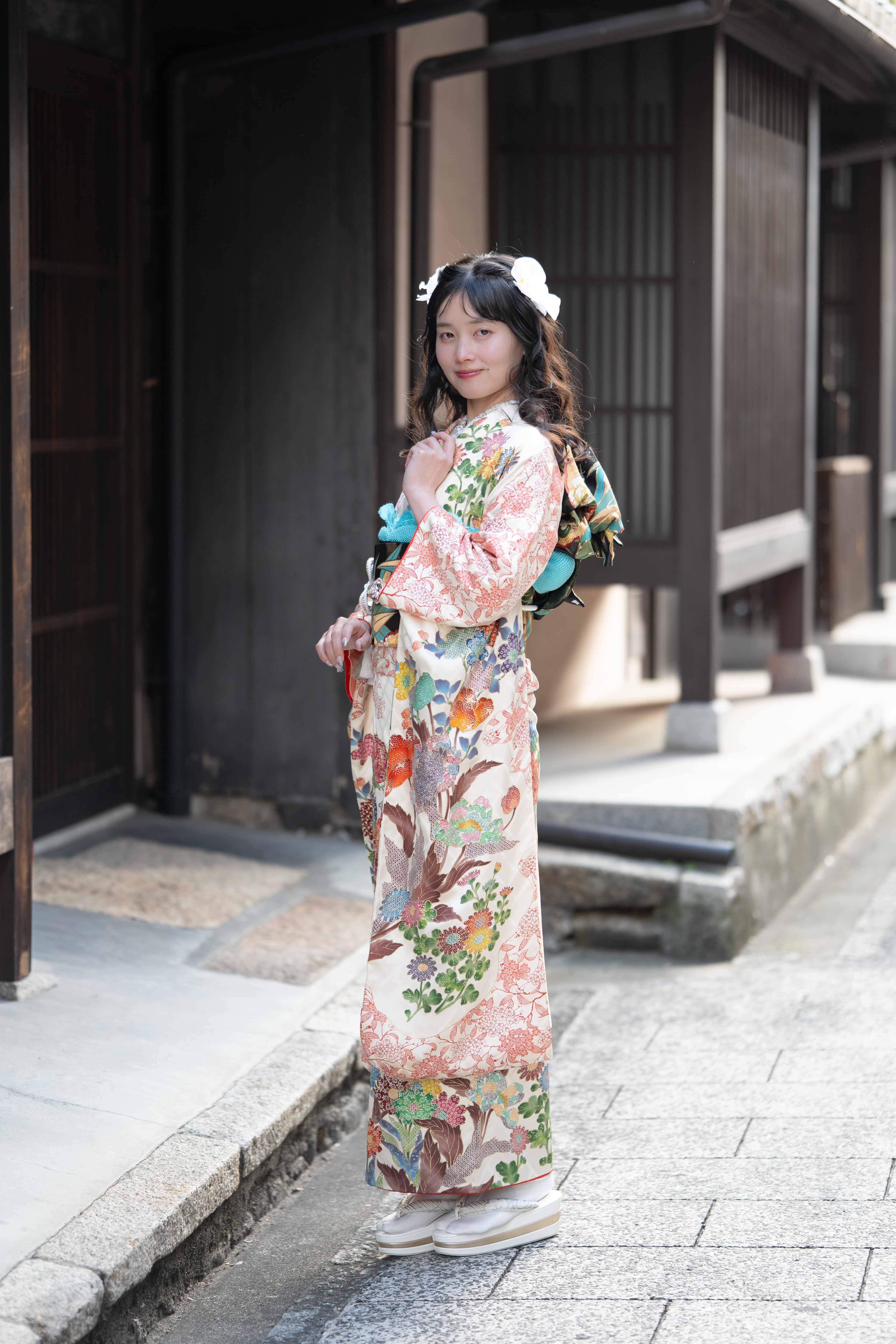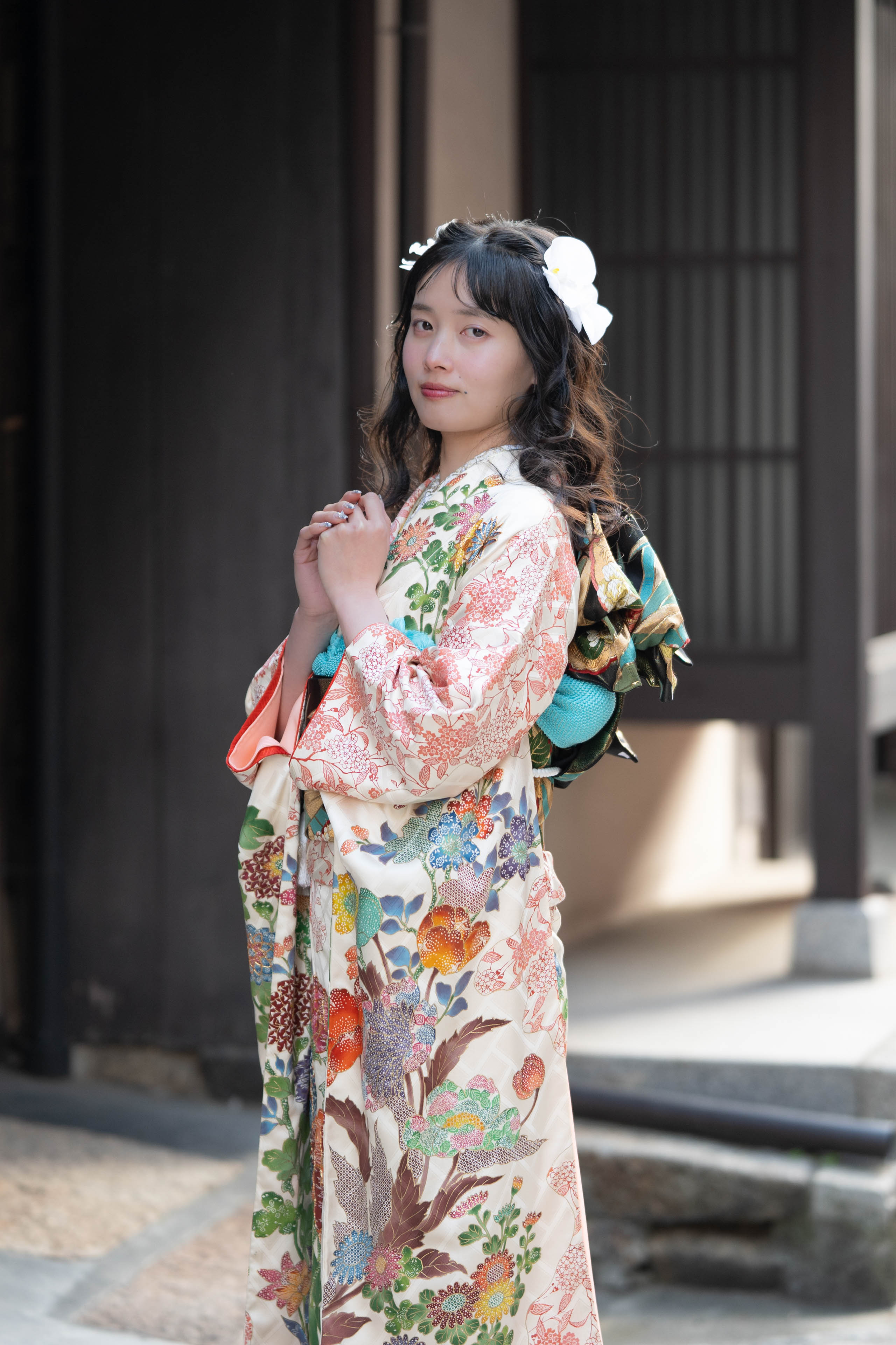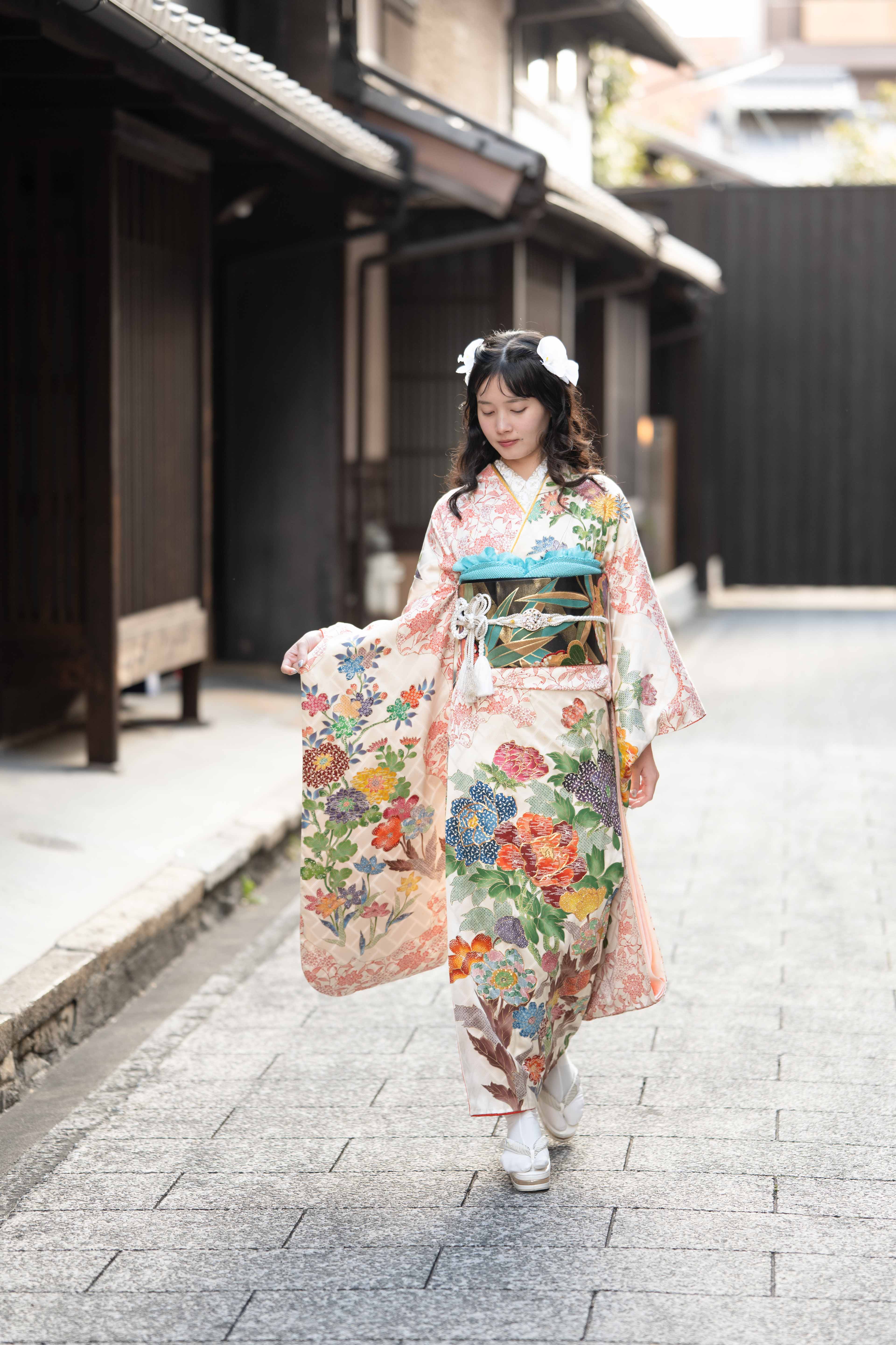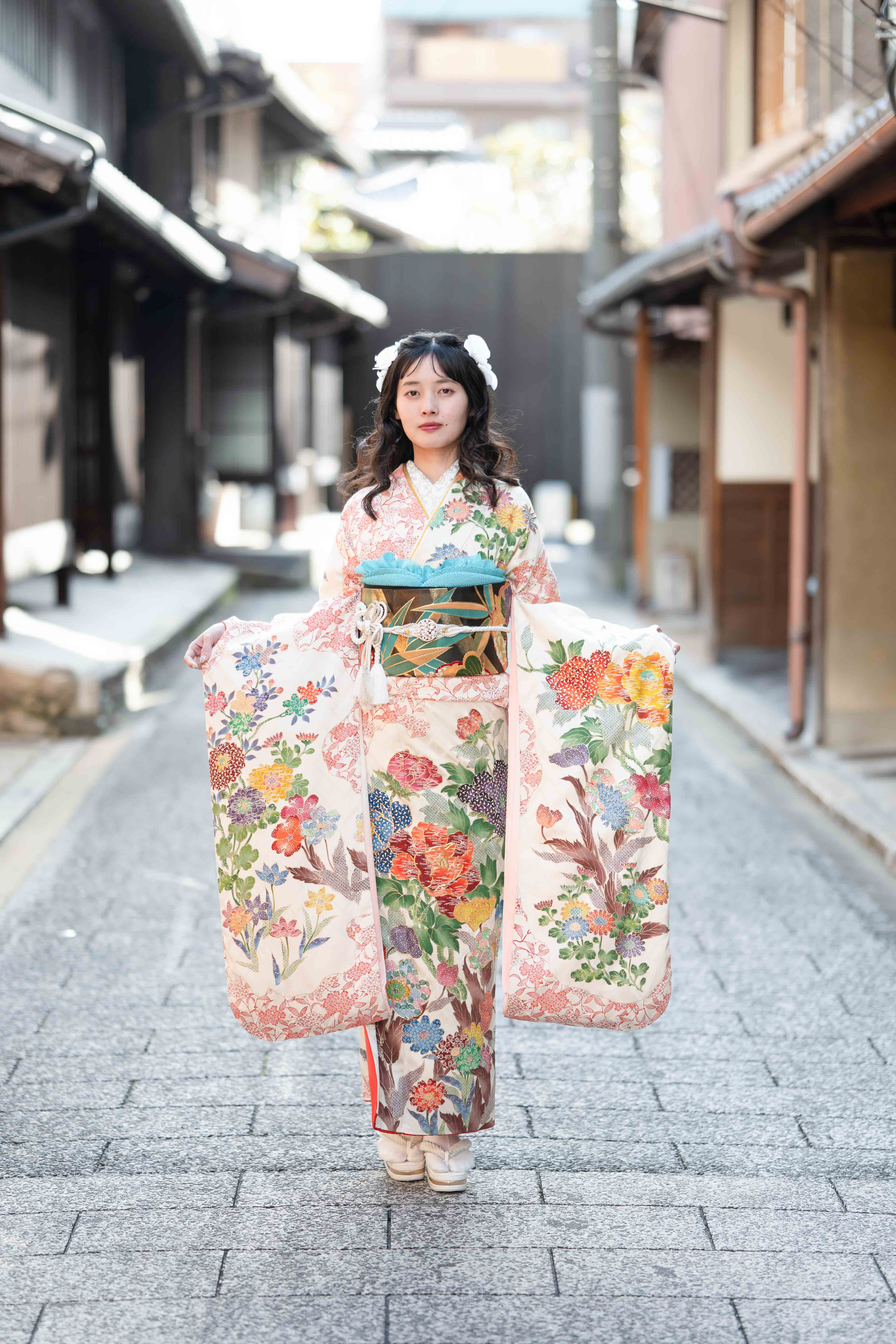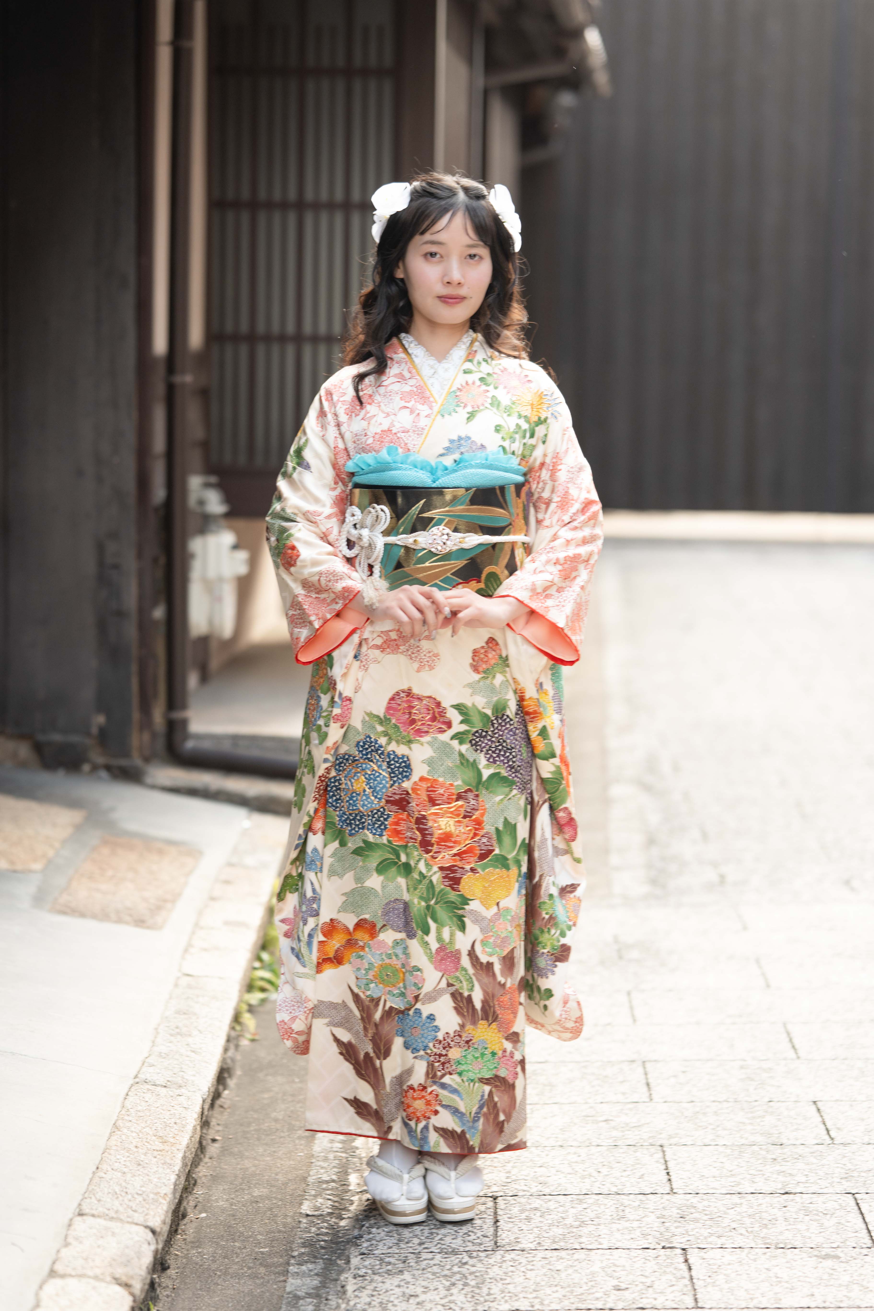 白色の地色に色とりどりの花文様が着物全体に大きくひろがった明るい印象の振袖です。