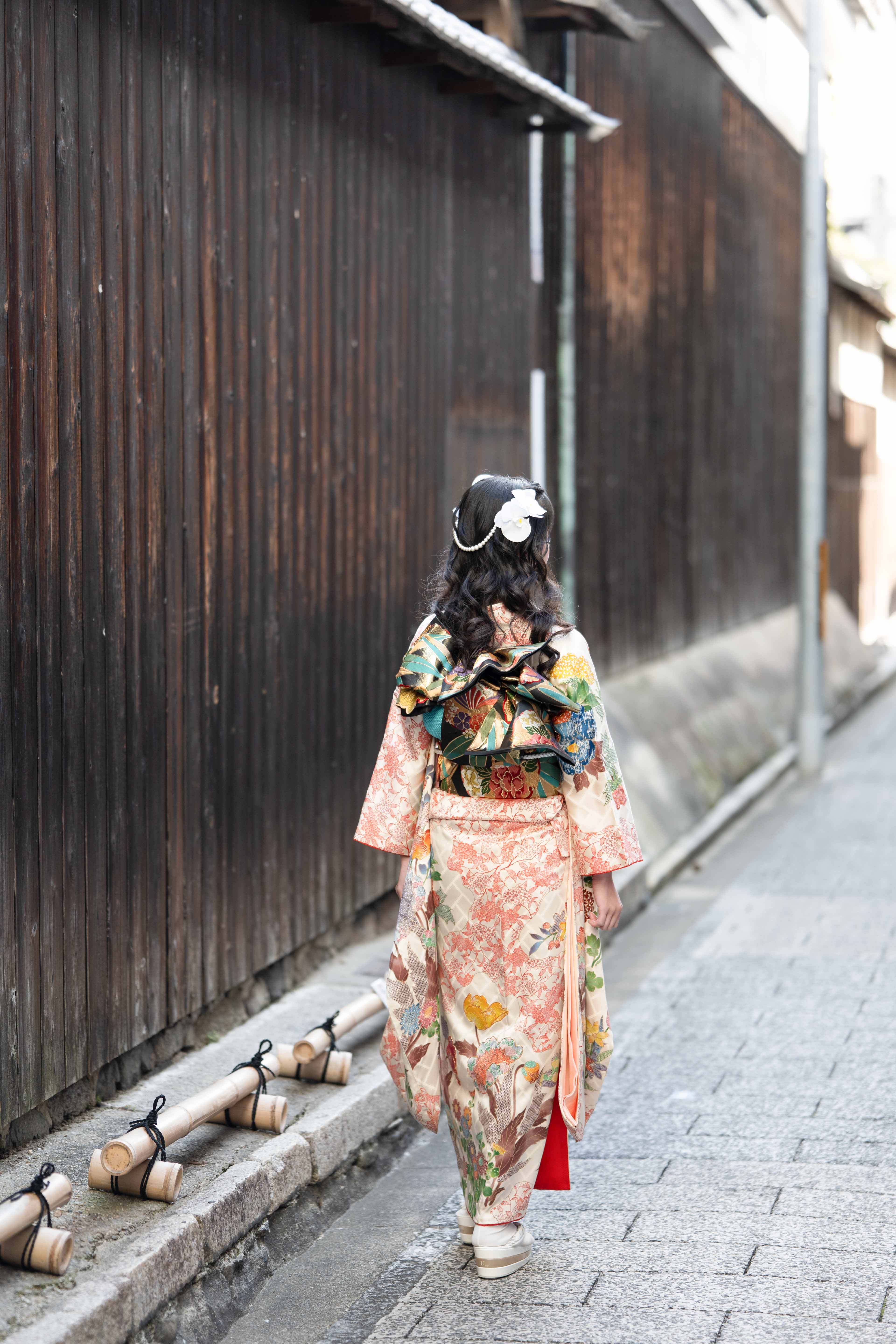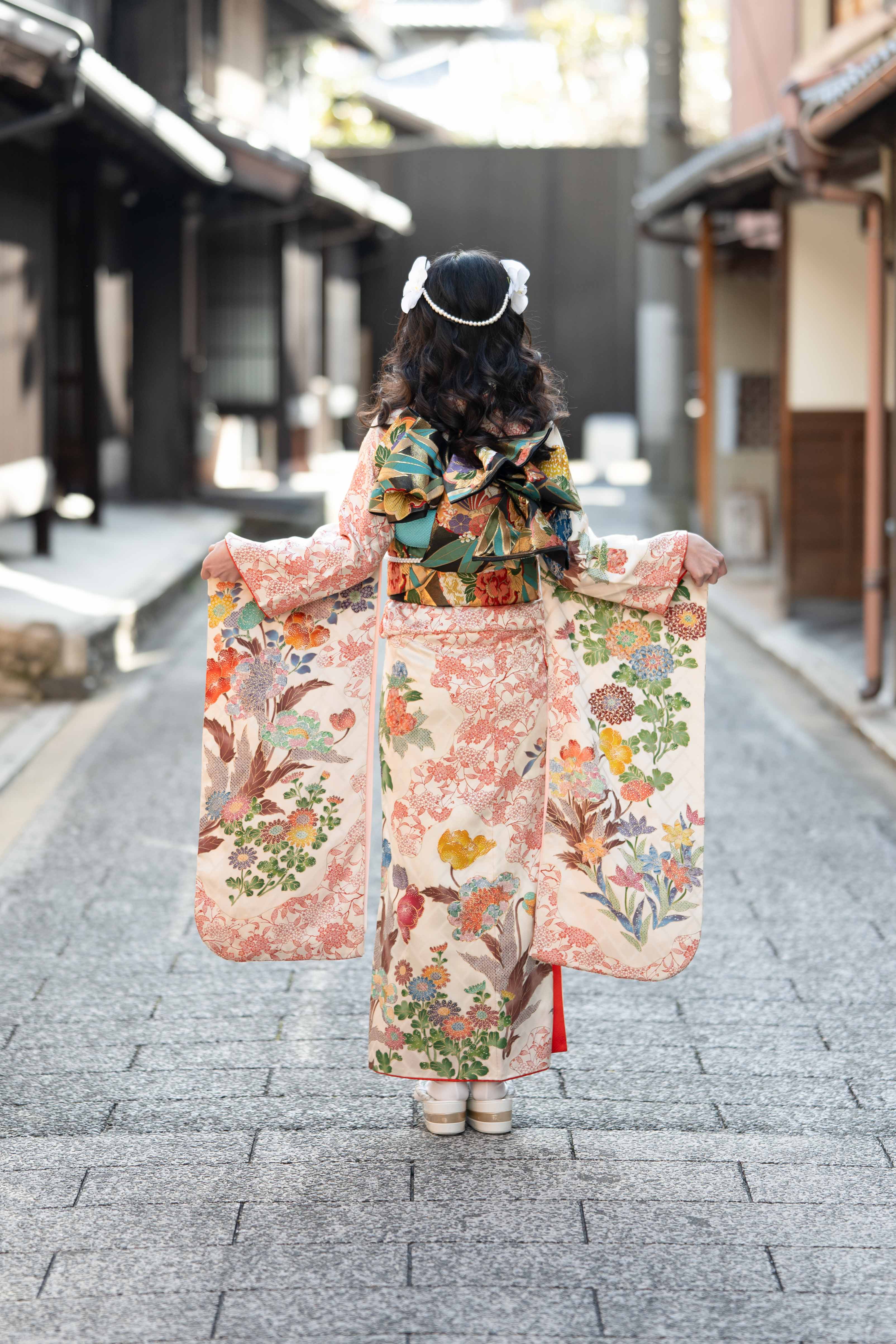 着物・帯・帯締め・帯揚げ・襦袢・肌着・タオル2枚・腰ひも6本・伊達締め2本・コーリンベルト・三重仮紐・前板・後板・枕・衿芯・重ね衿・バッグ・草履・足袋・髪飾り(足袋・髪飾りは新品プレゼント)